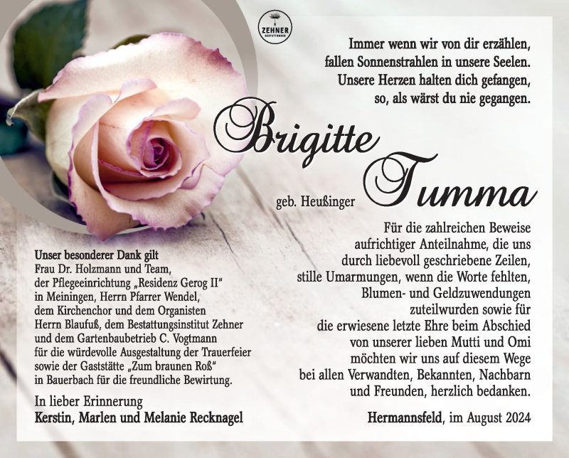 Hier finden Sie alle Traueranzeigen aus der Zeitung, die bisher für Brigitte Tumma erschienen sind. Weitere Traueranzeigen, die in der Zeitung erscheinen, werden hier ebenfalls aufgelistet