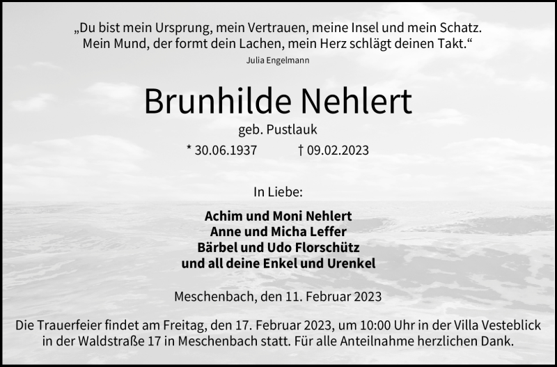 Hier finden Sie alle Traueranzeigen aus der Zeitung, die bisher für Brunhilde Nehlert erschienen sind. Weitere Traueranzeigen, die in der Zeitung erscheinen, werden hier ebenfalls aufgelistet