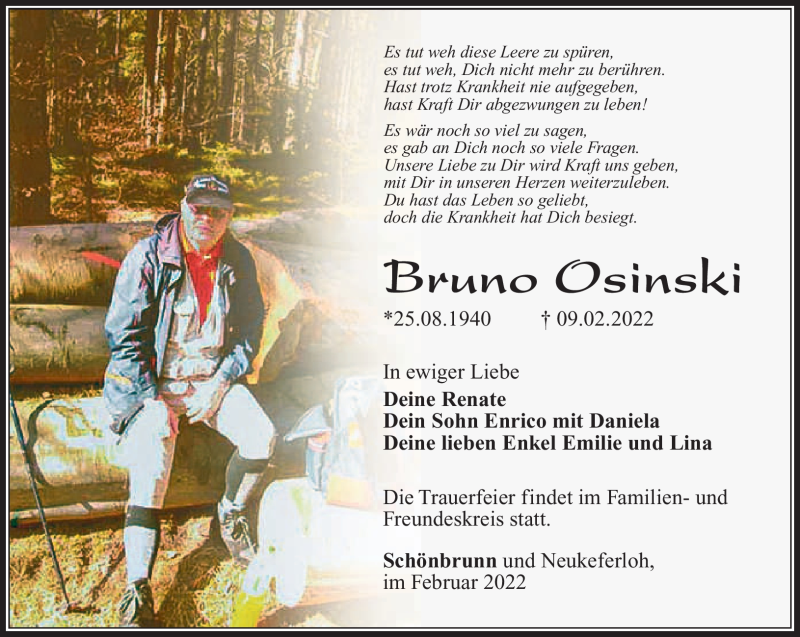Hier finden Sie alle Traueranzeigen aus der Zeitung, die bisher für Bruno Osinski erschienen sind. Weitere Traueranzeigen, die in der Zeitung erscheinen, werden hier ebenfalls aufgelistet