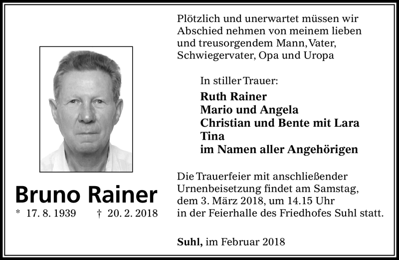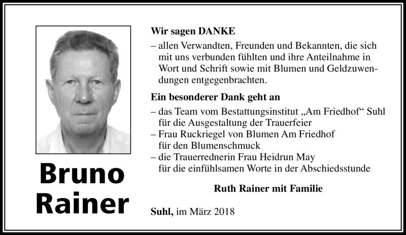 Hier finden Sie alle Traueranzeigen aus der Zeitung, die bisher für Bruno Rainer erschienen sind. Weitere Traueranzeigen, die in der Zeitung erscheinen, werden hier ebenfalls aufgelistet