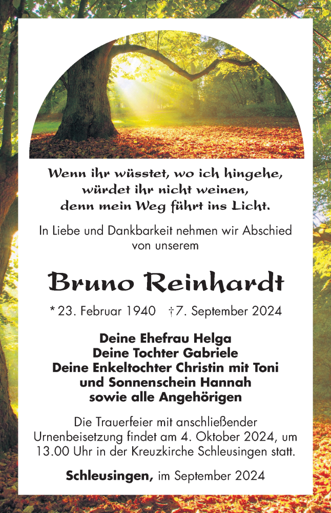 Hier finden Sie alle Traueranzeigen aus der Zeitung, die bisher für Bruno Reinhardt erschienen sind. Weitere Traueranzeigen, die in der Zeitung erscheinen, werden hier ebenfalls aufgelistet