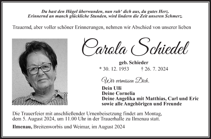 Hier finden Sie alle Traueranzeigen aus der Zeitung, die bisher für Carola Schiedel erschienen sind. Weitere Traueranzeigen, die in der Zeitung erscheinen, werden hier ebenfalls aufgelistet