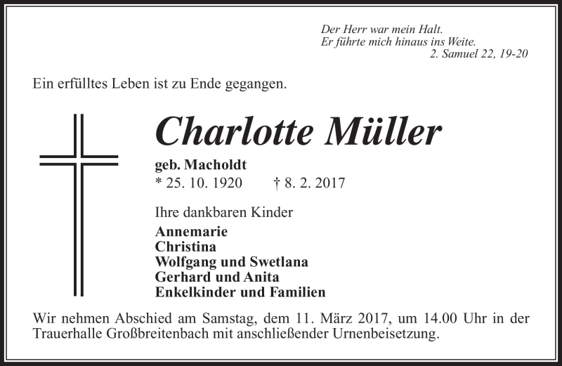 Hier finden Sie alle Traueranzeigen aus der Zeitung, die bisher für Charlotte Müller erschienen sind. Weitere Traueranzeigen, die in der Zeitung erscheinen, werden hier ebenfalls aufgelistet