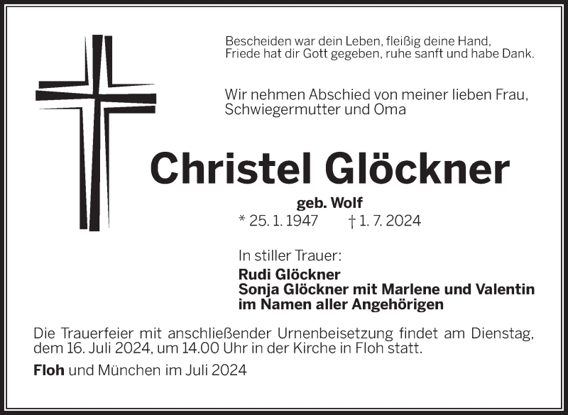 Hier finden Sie alle Traueranzeigen aus der Zeitung, die bisher für Christa Glöckner erschienen sind. Weitere Traueranzeigen, die in der Zeitung erscheinen, werden hier ebenfalls aufgelistet