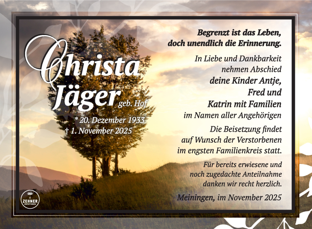 Hier finden Sie alle Traueranzeigen aus der Zeitung, die bisher für Christa Jäger erschienen sind. Weitere Traueranzeigen, die in der Zeitung erscheinen, werden hier ebenfalls aufgelistet