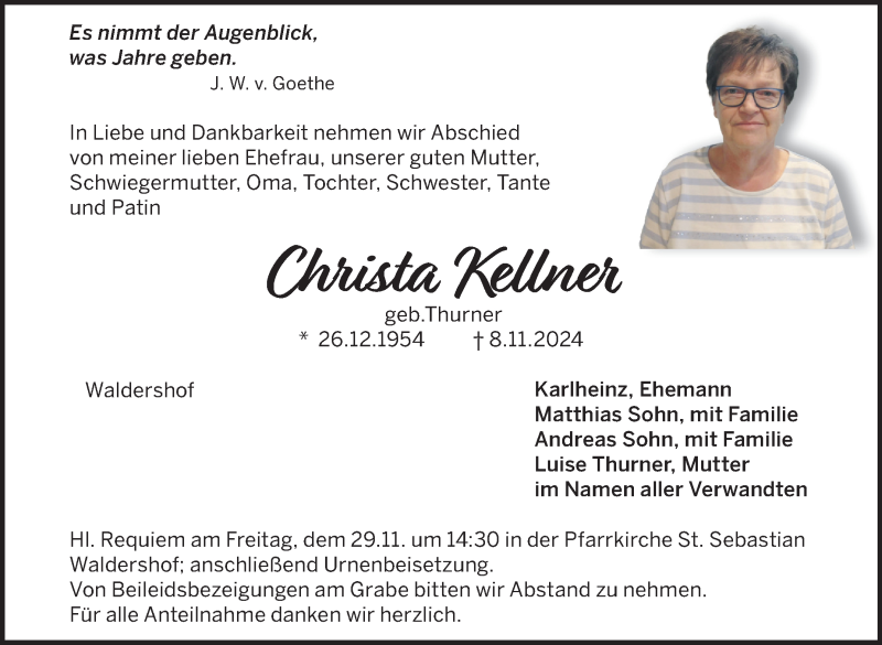 Hier finden Sie alle Traueranzeigen aus der Zeitung, die bisher für Christa Kellner erschienen sind. Weitere Traueranzeigen, die in der Zeitung erscheinen, werden hier ebenfalls aufgelistet
