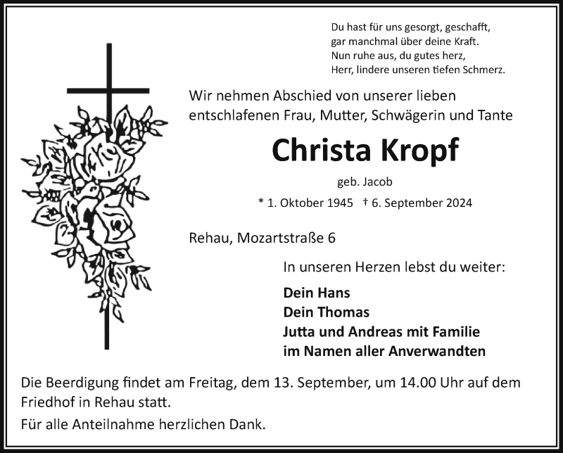 Hier finden Sie alle Traueranzeigen aus der Zeitung, die bisher für Christa Kropf erschienen sind. Weitere Traueranzeigen, die in der Zeitung erscheinen, werden hier ebenfalls aufgelistet
