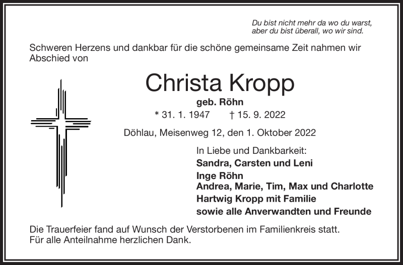 Hier finden Sie alle Traueranzeigen aus der Zeitung, die bisher für Christa Kropp erschienen sind. Weitere Traueranzeigen, die in der Zeitung erscheinen, werden hier ebenfalls aufgelistet