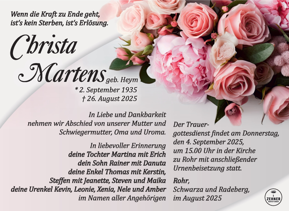 Hier finden Sie alle Traueranzeigen aus der Zeitung, die bisher für Christa Martens erschienen sind. Weitere Traueranzeigen, die in der Zeitung erscheinen, werden hier ebenfalls aufgelistet