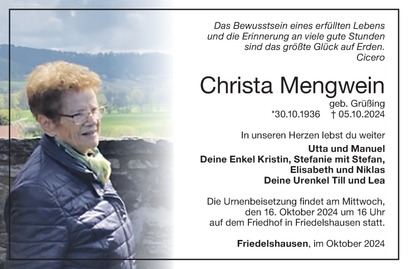 Hier finden Sie alle Traueranzeigen aus der Zeitung, die bisher für Christa Mengwein erschienen sind. Weitere Traueranzeigen, die in der Zeitung erscheinen, werden hier ebenfalls aufgelistet