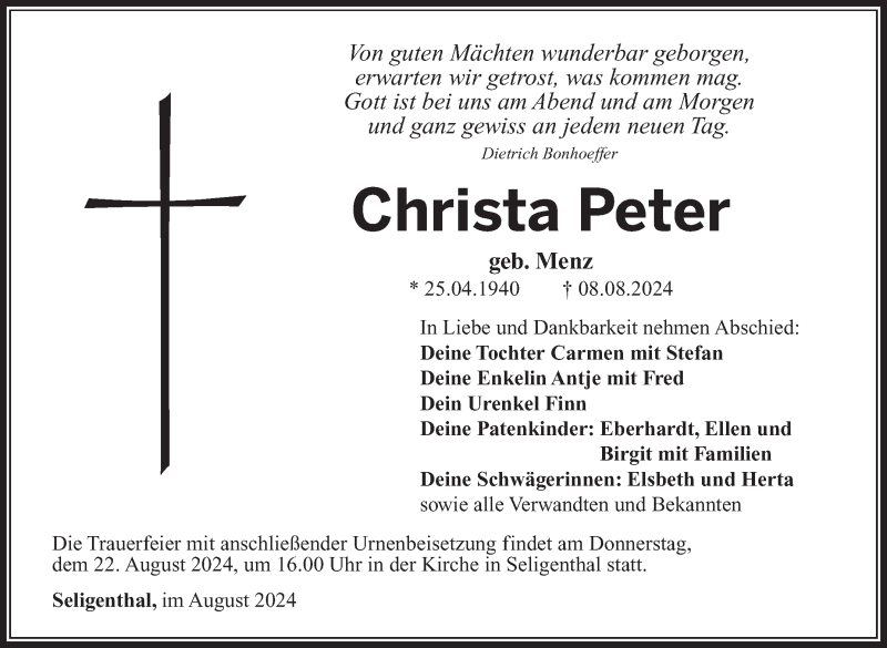 Hier finden Sie alle Traueranzeigen aus der Zeitung, die bisher für Christa Peter erschienen sind. Weitere Traueranzeigen, die in der Zeitung erscheinen, werden hier ebenfalls aufgelistet