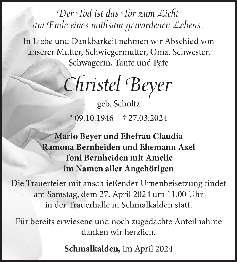 Hier finden Sie alle Traueranzeigen aus der Zeitung, die bisher für Christel Beyer erschienen sind. Weitere Traueranzeigen, die in der Zeitung erscheinen, werden hier ebenfalls aufgelistet