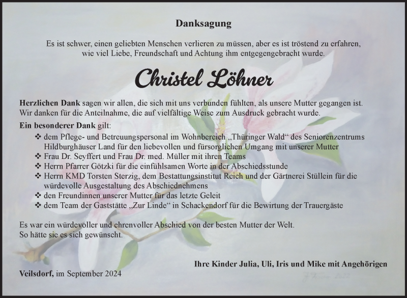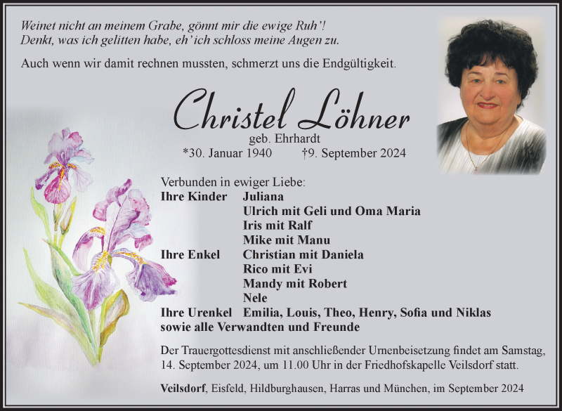 Hier finden Sie alle Traueranzeigen aus der Zeitung, die bisher für Christel Löhner erschienen sind. Weitere Traueranzeigen, die in der Zeitung erscheinen, werden hier ebenfalls aufgelistet