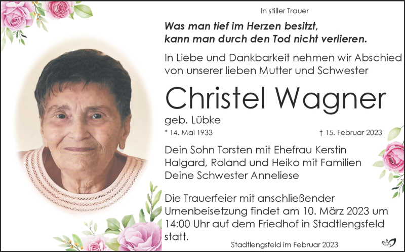 Hier finden Sie alle Traueranzeigen aus der Zeitung, die bisher für Christel Wagner erschienen sind. Weitere Traueranzeigen, die in der Zeitung erscheinen, werden hier ebenfalls aufgelistet
