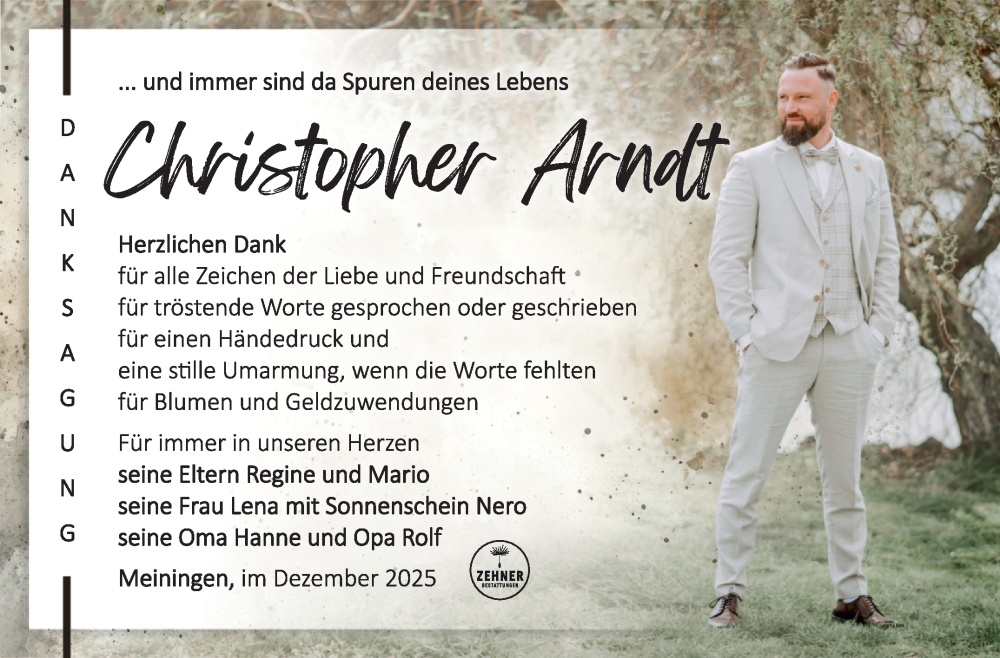Hier finden Sie alle Traueranzeigen aus der Zeitung, die bisher für Christopher Arndt erschienen sind. Weitere Traueranzeigen, die in der Zeitung erscheinen, werden hier ebenfalls aufgelistet