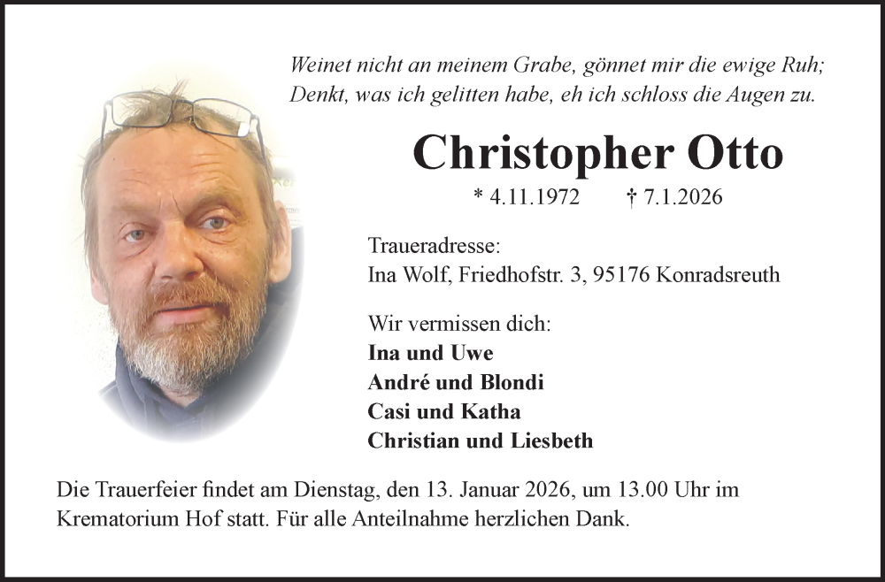 Hier finden Sie alle Traueranzeigen aus der Zeitung, die bisher für Christopher Otto erschienen sind. Weitere Traueranzeigen, die in der Zeitung erscheinen, werden hier ebenfalls aufgelistet