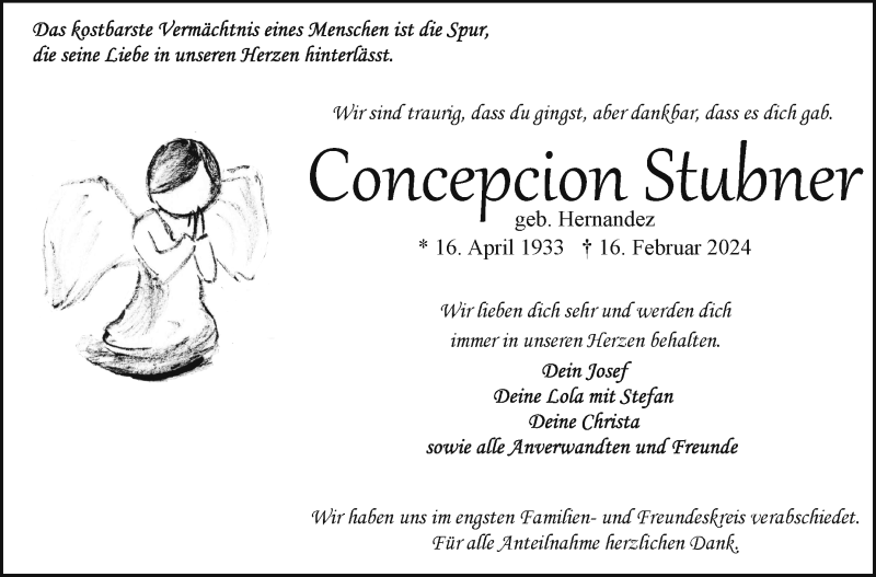 Hier finden Sie alle Traueranzeigen aus der Zeitung, die bisher für Concepcion Stubner erschienen sind. Weitere Traueranzeigen, die in der Zeitung erscheinen, werden hier ebenfalls aufgelistet