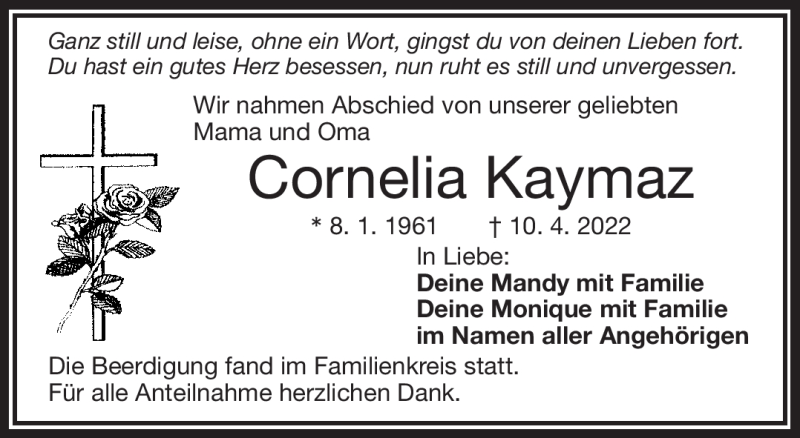 Hier finden Sie alle Traueranzeigen aus der Zeitung, die bisher für Cornelia Kaymaz erschienen sind. Weitere Traueranzeigen, die in der Zeitung erscheinen, werden hier ebenfalls aufgelistet