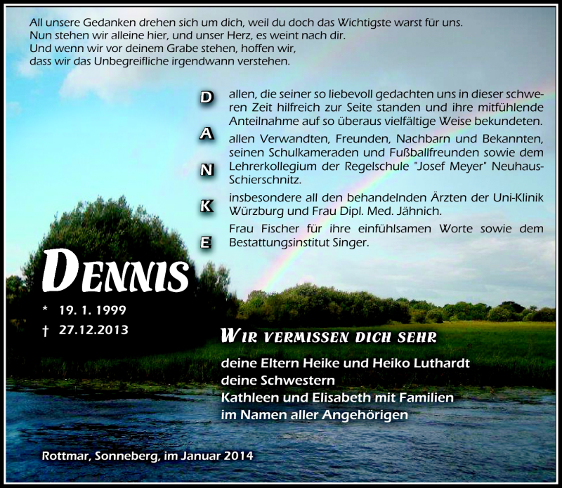 Hier finden Sie alle Traueranzeigen aus der Zeitung, die bisher für Dennis Luthardt erschienen sind. Weitere Traueranzeigen, die in der Zeitung erscheinen, werden hier ebenfalls aufgelistet