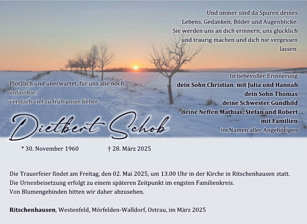 Hier finden Sie alle Traueranzeigen aus der Zeitung, die bisher für Dietbert Schob erschienen sind. Weitere Traueranzeigen, die in der Zeitung erscheinen, werden hier ebenfalls aufgelistet