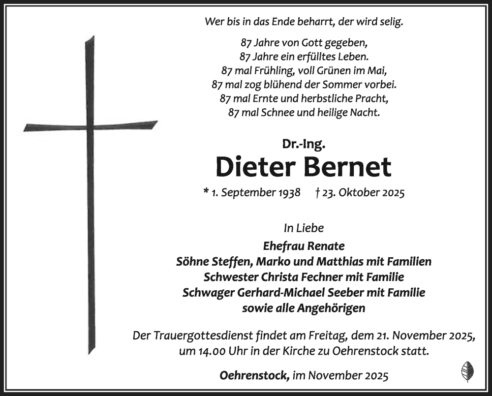 Hier finden Sie alle Traueranzeigen aus der Zeitung, die bisher für Dieter Bernet erschienen sind. Weitere Traueranzeigen, die in der Zeitung erscheinen, werden hier ebenfalls aufgelistet