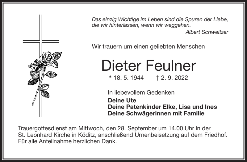 Hier finden Sie alle Traueranzeigen aus der Zeitung, die bisher für Dieter Feulner erschienen sind. Weitere Traueranzeigen, die in der Zeitung erscheinen, werden hier ebenfalls aufgelistet