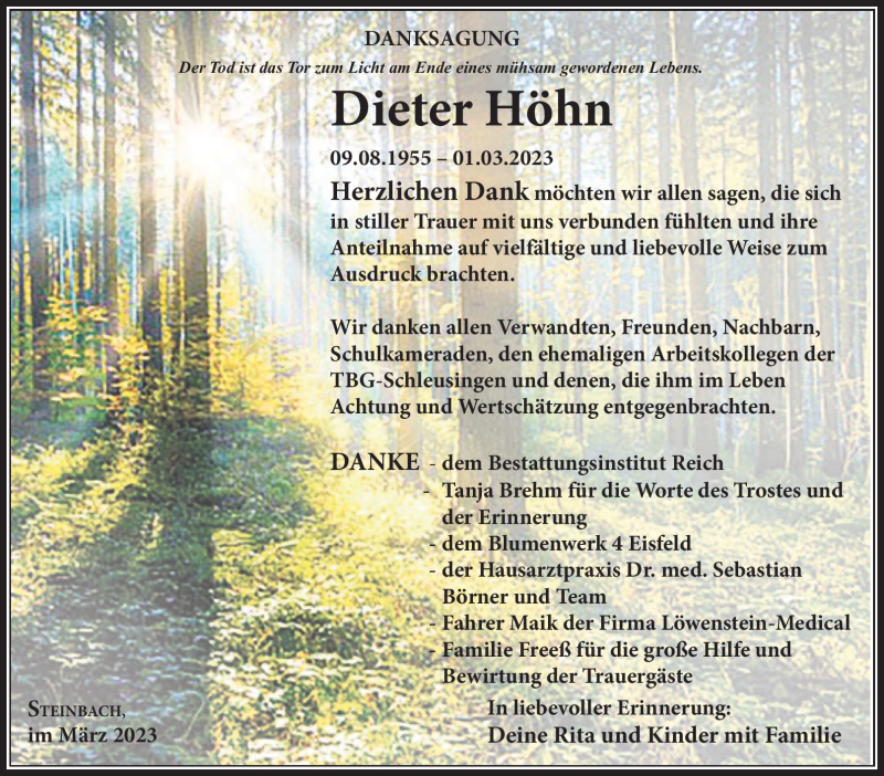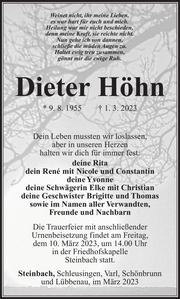 Hier finden Sie alle Traueranzeigen aus der Zeitung, die bisher für Dieter Höhn erschienen sind. Weitere Traueranzeigen, die in der Zeitung erscheinen, werden hier ebenfalls aufgelistet