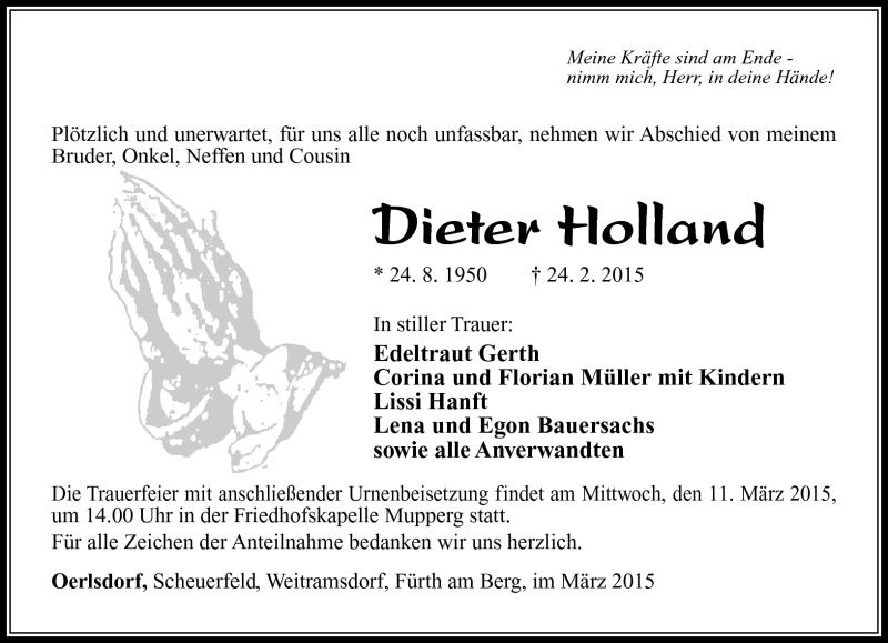 Hier finden Sie alle Traueranzeigen aus der Zeitung, die bisher für Dieter Holland erschienen sind. Weitere Traueranzeigen, die in der Zeitung erscheinen, werden hier ebenfalls aufgelistet