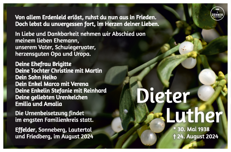 Hier finden Sie alle Traueranzeigen aus der Zeitung, die bisher für Dieter Luther erschienen sind. Weitere Traueranzeigen, die in der Zeitung erscheinen, werden hier ebenfalls aufgelistet