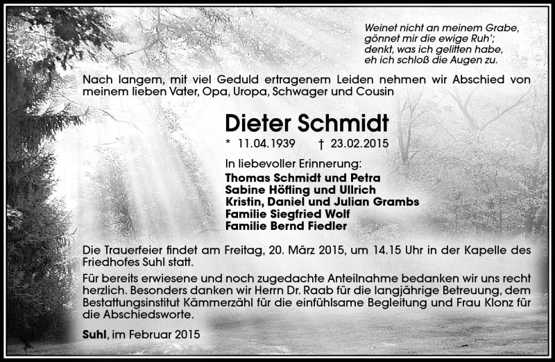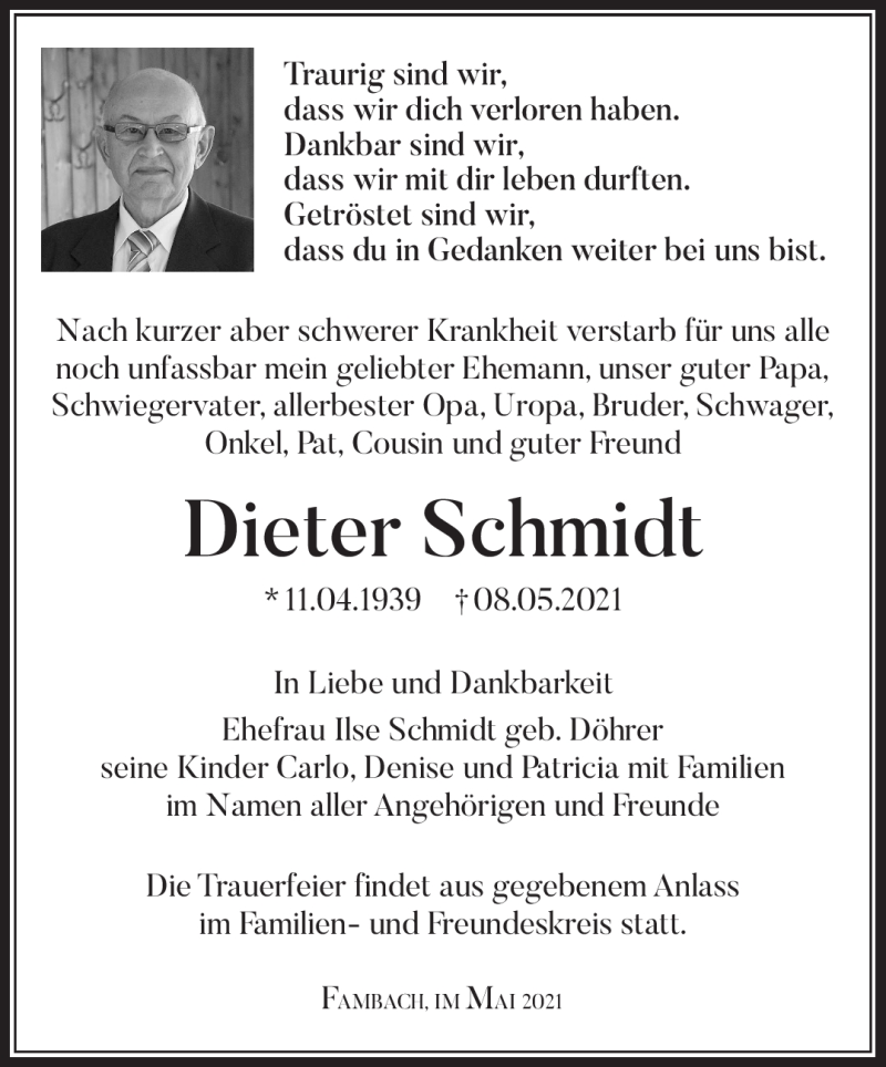 Hier finden Sie alle Traueranzeigen aus der Zeitung, die bisher für Dieter Schmidt erschienen sind. Weitere Traueranzeigen, die in der Zeitung erscheinen, werden hier ebenfalls aufgelistet