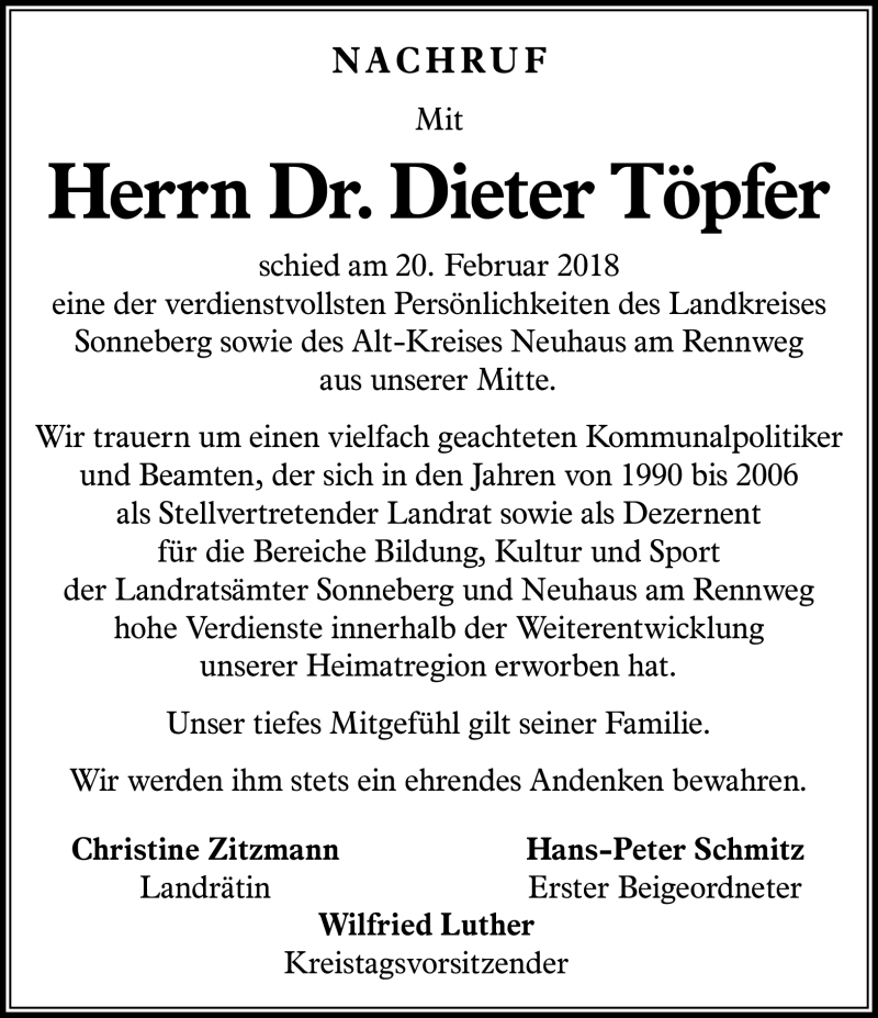 Hier finden Sie alle Traueranzeigen aus der Zeitung, die bisher für Dieter Töpfer erschienen sind. Weitere Traueranzeigen, die in der Zeitung erscheinen, werden hier ebenfalls aufgelistet