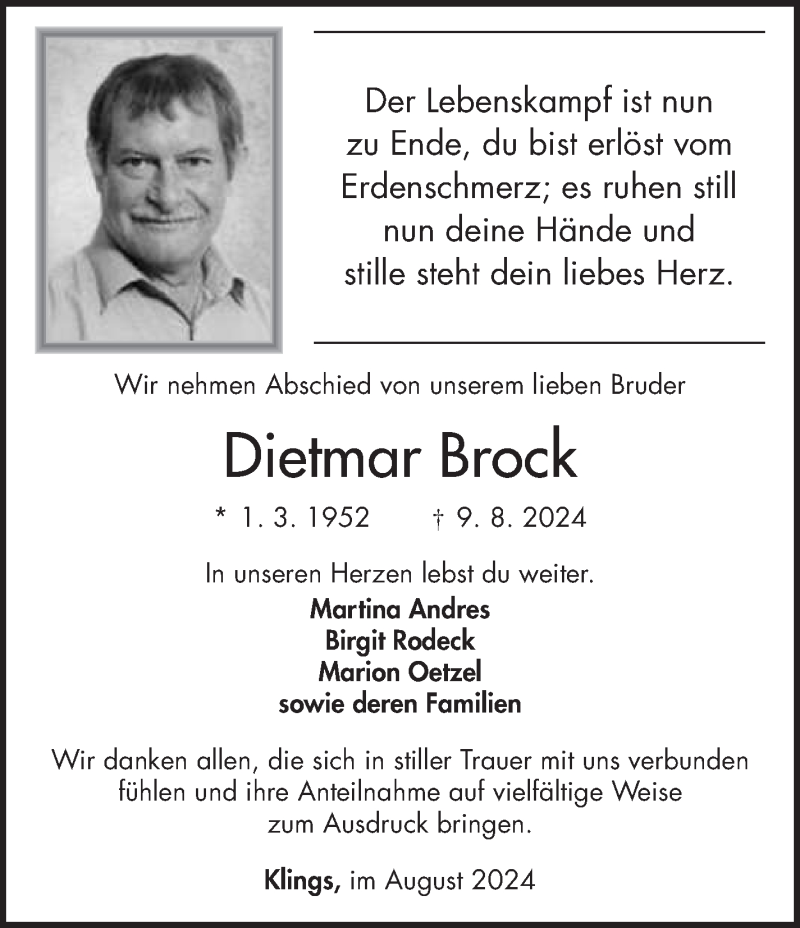 Hier finden Sie alle Traueranzeigen aus der Zeitung, die bisher für Dietmar Brock erschienen sind. Weitere Traueranzeigen, die in der Zeitung erscheinen, werden hier ebenfalls aufgelistet