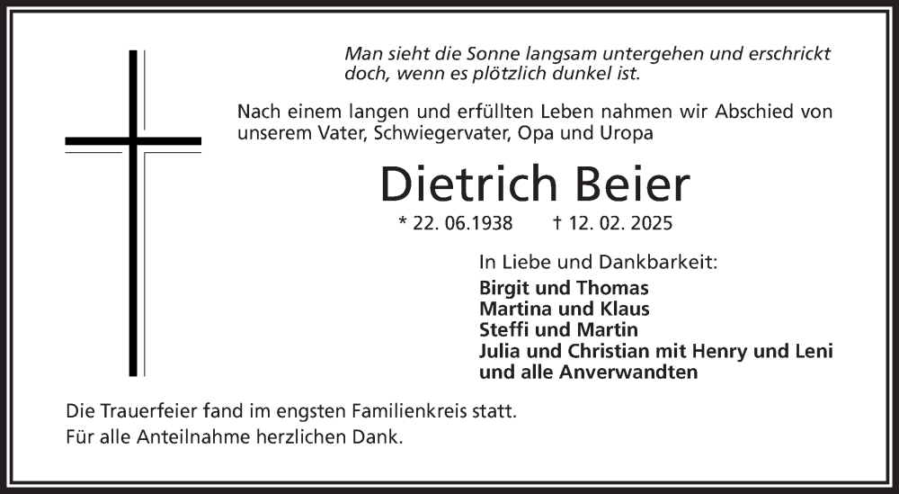Hier finden Sie alle Traueranzeigen aus der Zeitung, die bisher für Dietrich Beier erschienen sind. Weitere Traueranzeigen, die in der Zeitung erscheinen, werden hier ebenfalls aufgelistet