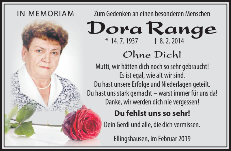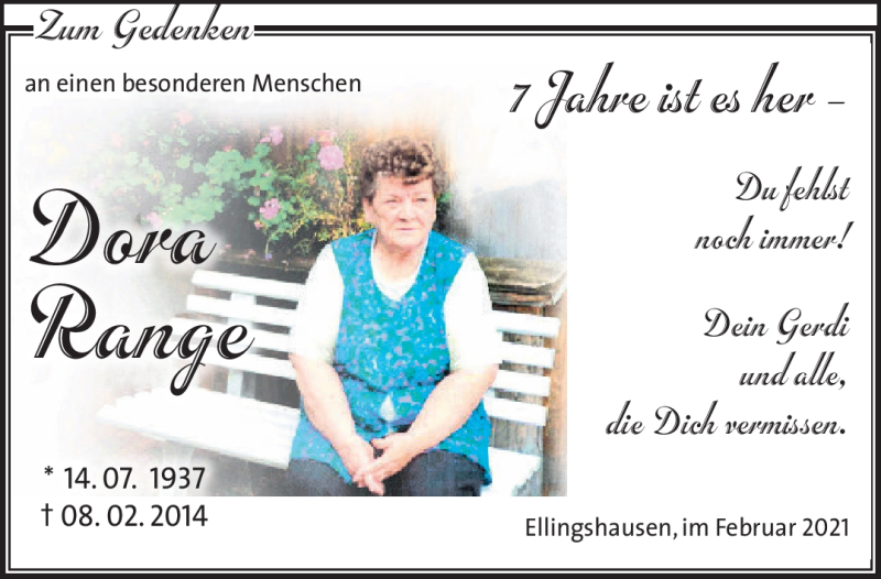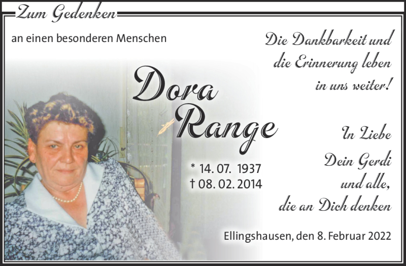 Hier finden Sie alle Traueranzeigen aus der Zeitung, die bisher für Dora Range erschienen sind. Weitere Traueranzeigen, die in der Zeitung erscheinen, werden hier ebenfalls aufgelistet