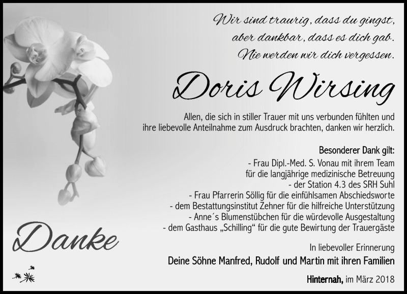 Hier finden Sie alle Traueranzeigen aus der Zeitung, die bisher für Doris Wirsing erschienen sind. Weitere Traueranzeigen, die in der Zeitung erscheinen, werden hier ebenfalls aufgelistet