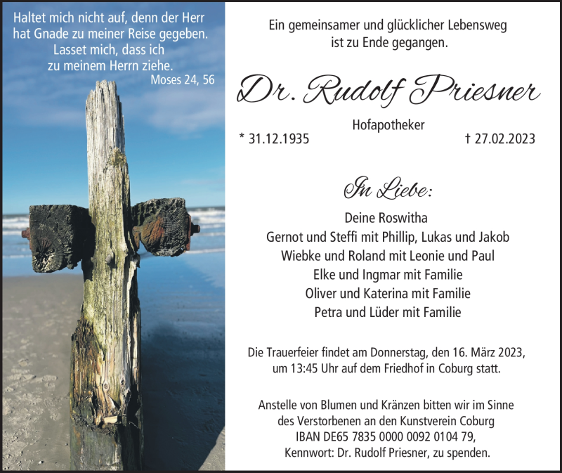 Hier finden Sie alle Traueranzeigen aus der Zeitung, die bisher für Dr. Rudolf Priesner erschienen sind. Weitere Traueranzeigen, die in der Zeitung erscheinen, werden hier ebenfalls aufgelistet