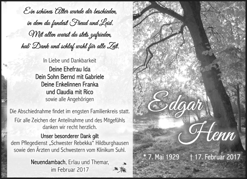 Hier finden Sie alle Traueranzeigen aus der Zeitung, die bisher für Edgar Henn erschienen sind. Weitere Traueranzeigen, die in der Zeitung erscheinen, werden hier ebenfalls aufgelistet