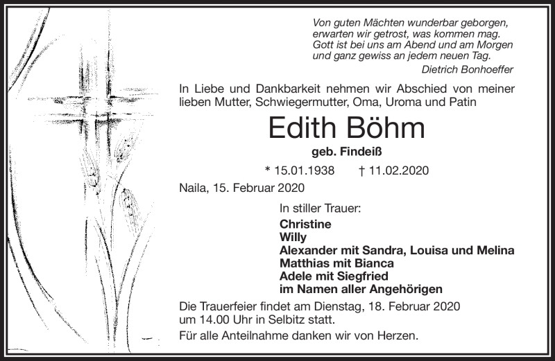 Hier finden Sie alle Traueranzeigen aus der Zeitung, die bisher für Edith Böhm erschienen sind. Weitere Traueranzeigen, die in der Zeitung erscheinen, werden hier ebenfalls aufgelistet