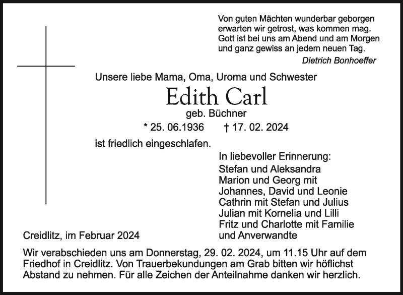 Hier finden Sie alle Traueranzeigen aus der Zeitung, die bisher für Edith Carl erschienen sind. Weitere Traueranzeigen, die in der Zeitung erscheinen, werden hier ebenfalls aufgelistet