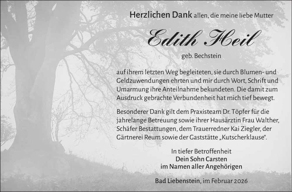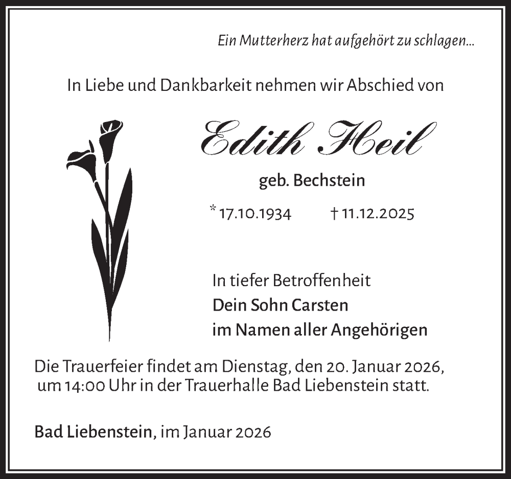 Hier finden Sie alle Traueranzeigen aus der Zeitung, die bisher für Edith Heil erschienen sind. Weitere Traueranzeigen, die in der Zeitung erscheinen, werden hier ebenfalls aufgelistet