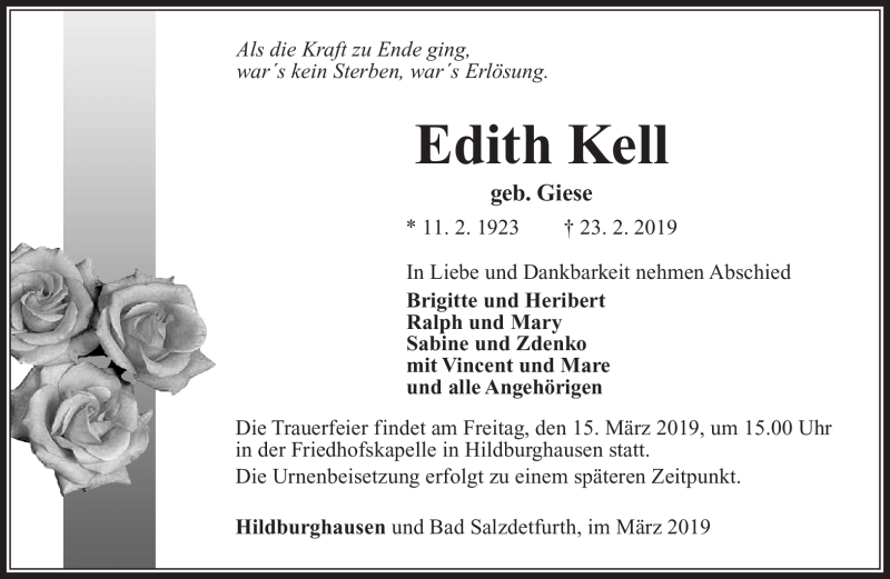 Hier finden Sie alle Traueranzeigen aus der Zeitung, die bisher für Edith Kell erschienen sind. Weitere Traueranzeigen, die in der Zeitung erscheinen, werden hier ebenfalls aufgelistet