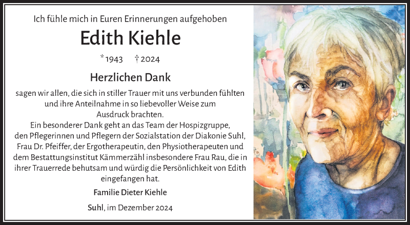 Hier finden Sie alle Traueranzeigen aus der Zeitung, die bisher für Edith Kiehle erschienen sind. Weitere Traueranzeigen, die in der Zeitung erscheinen, werden hier ebenfalls aufgelistet