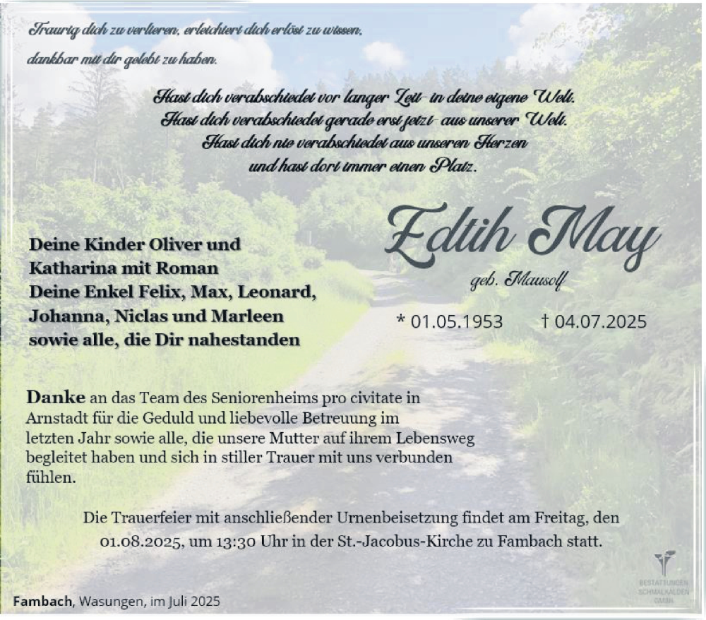 Hier finden Sie alle Traueranzeigen aus der Zeitung, die bisher für Edith May erschienen sind. Weitere Traueranzeigen, die in der Zeitung erscheinen, werden hier ebenfalls aufgelistet