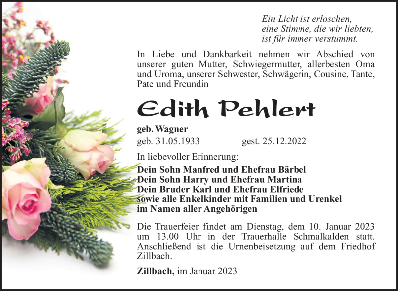 Hier finden Sie alle Traueranzeigen aus der Zeitung, die bisher für Edith Pehlert erschienen sind. Weitere Traueranzeigen, die in der Zeitung erscheinen, werden hier ebenfalls aufgelistet