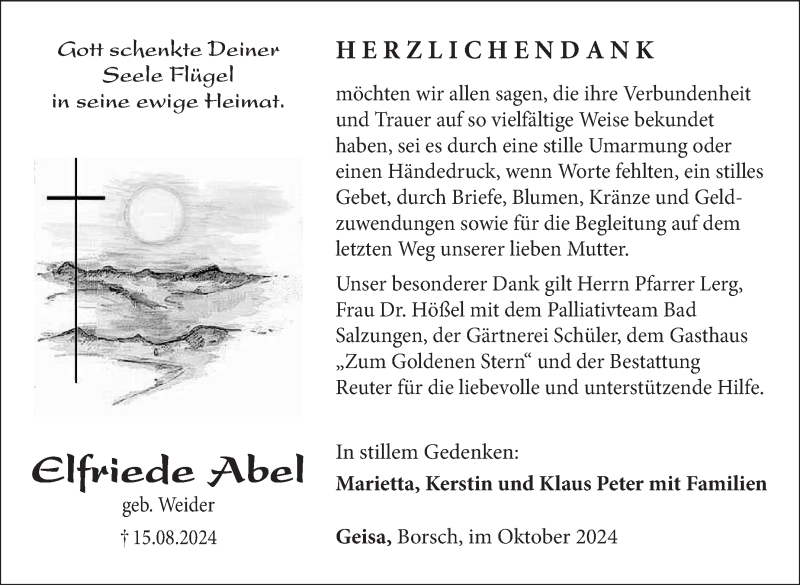 Hier finden Sie alle Traueranzeigen aus der Zeitung, die bisher für Elfriede Abel erschienen sind. Weitere Traueranzeigen, die in der Zeitung erscheinen, werden hier ebenfalls aufgelistet