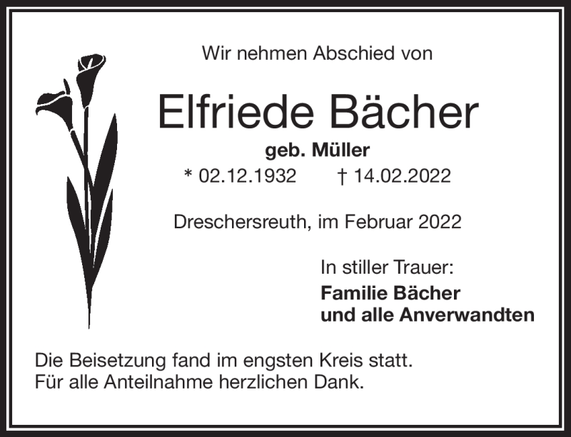 Hier finden Sie alle Traueranzeigen aus der Zeitung, die bisher für Elfriede Bächer erschienen sind. Weitere Traueranzeigen, die in der Zeitung erscheinen, werden hier ebenfalls aufgelistet