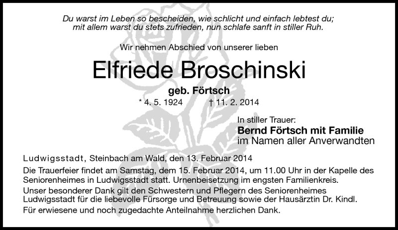 Hier finden Sie alle Traueranzeigen aus der Zeitung, die bisher für Elfriede Broschinski erschienen sind. Weitere Traueranzeigen, die in der Zeitung erscheinen, werden hier ebenfalls aufgelistet