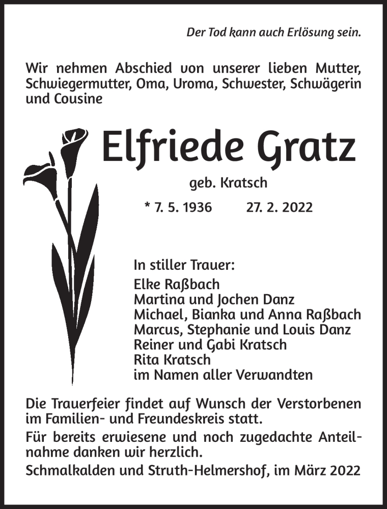 Hier finden Sie alle Traueranzeigen aus der Zeitung, die bisher für Elfriede Gratz erschienen sind. Weitere Traueranzeigen, die in der Zeitung erscheinen, werden hier ebenfalls aufgelistet