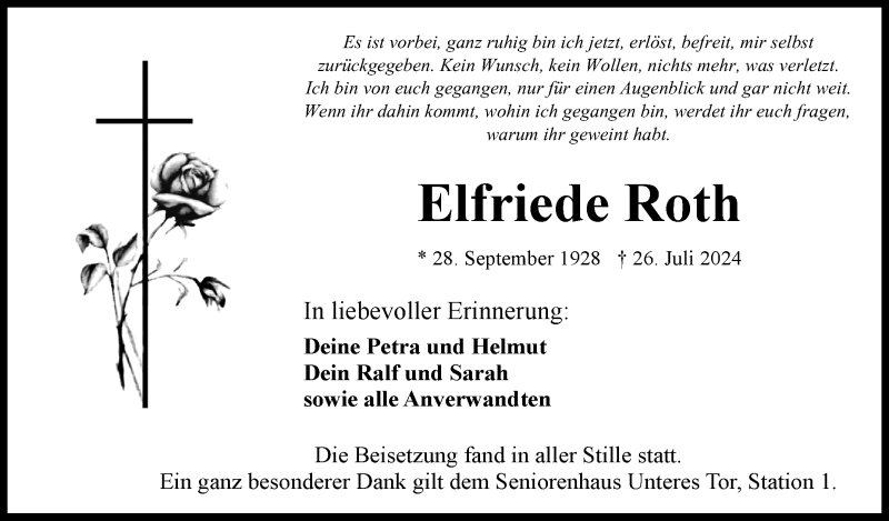 Hier finden Sie alle Traueranzeigen aus der Zeitung, die bisher für Elfriede Roth erschienen sind. Weitere Traueranzeigen, die in der Zeitung erscheinen, werden hier ebenfalls aufgelistet
