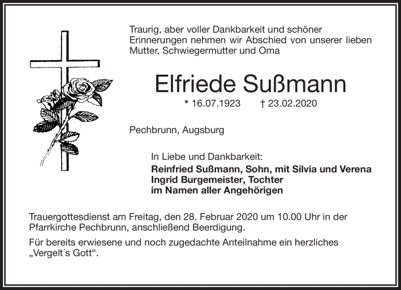 Hier finden Sie alle Traueranzeigen aus der Zeitung, die bisher für Elfriede Sußmann erschienen sind. Weitere Traueranzeigen, die in der Zeitung erscheinen, werden hier ebenfalls aufgelistet